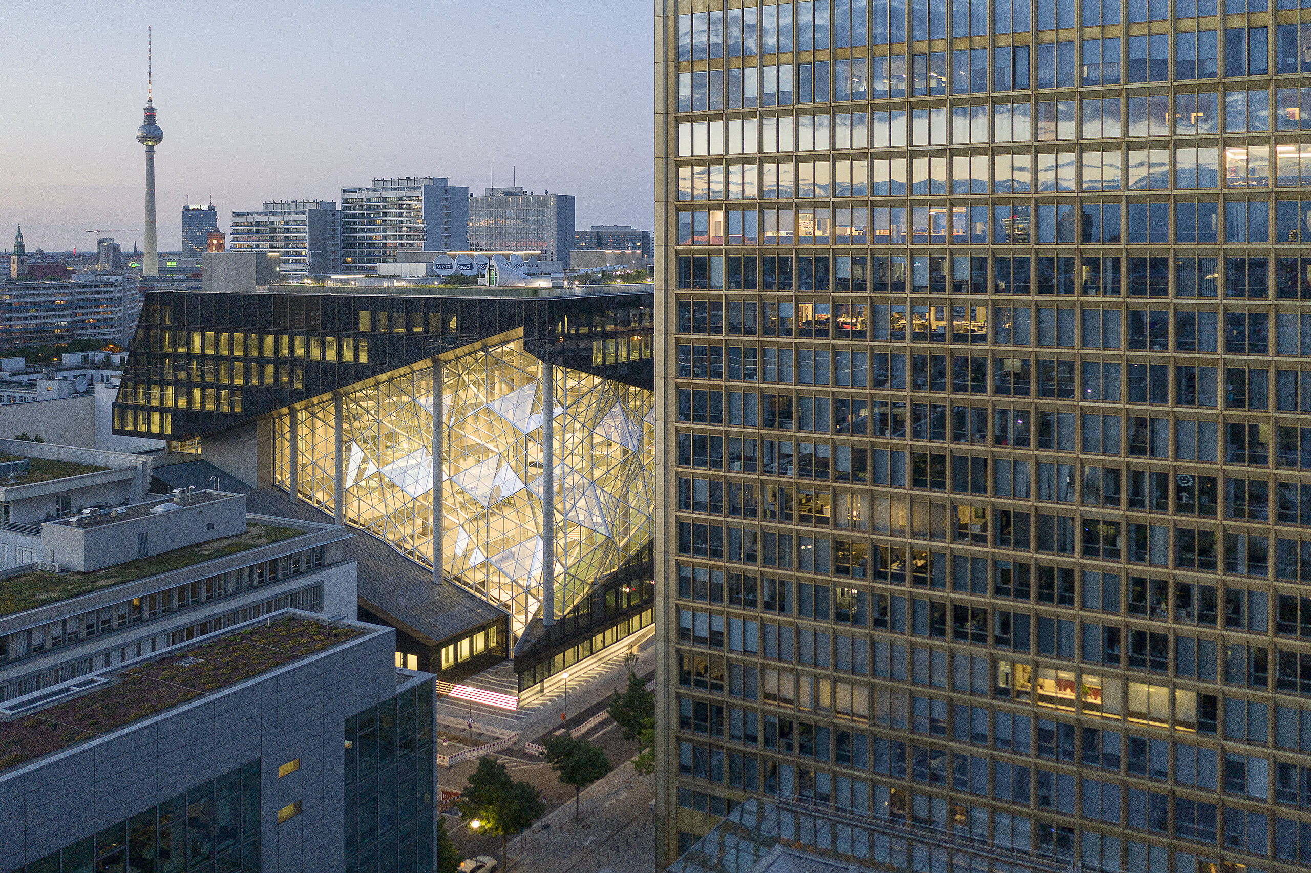Zentraler Bestandteil des Entwurfs ist ein von Terrassen gesäumtes, 40 m hohes Atrium, das sich zum bestehenden Axel-Springer-Hochhaus hin öffnet.