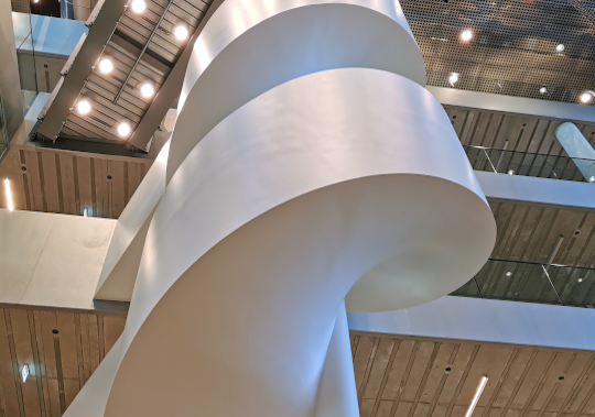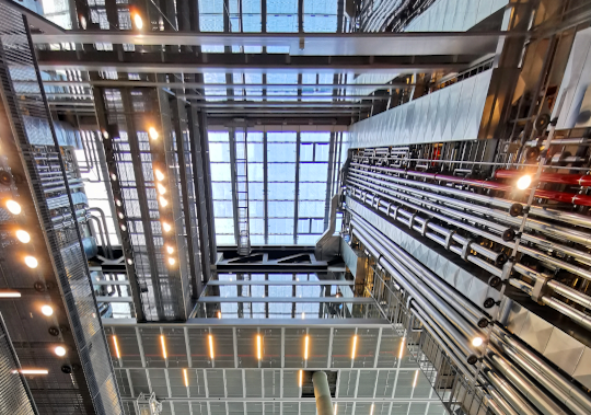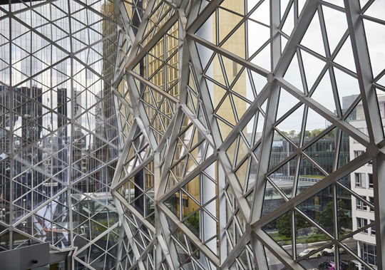Zentraler Bestandteil des Gebäudes ist ein von Terrassen gesäumtes, 40 m hohes Atrium.
