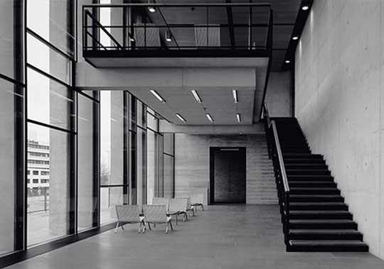 Folge des Gestaltungsanspruchs "Präzision" ist eine strenge Architektur in Form, Materialität und Farbigkeit: Flache kubische Baukörper aus Sichtbeton, Stahl und Glas, entsprechend der Länge betont horizontal gegliedert.