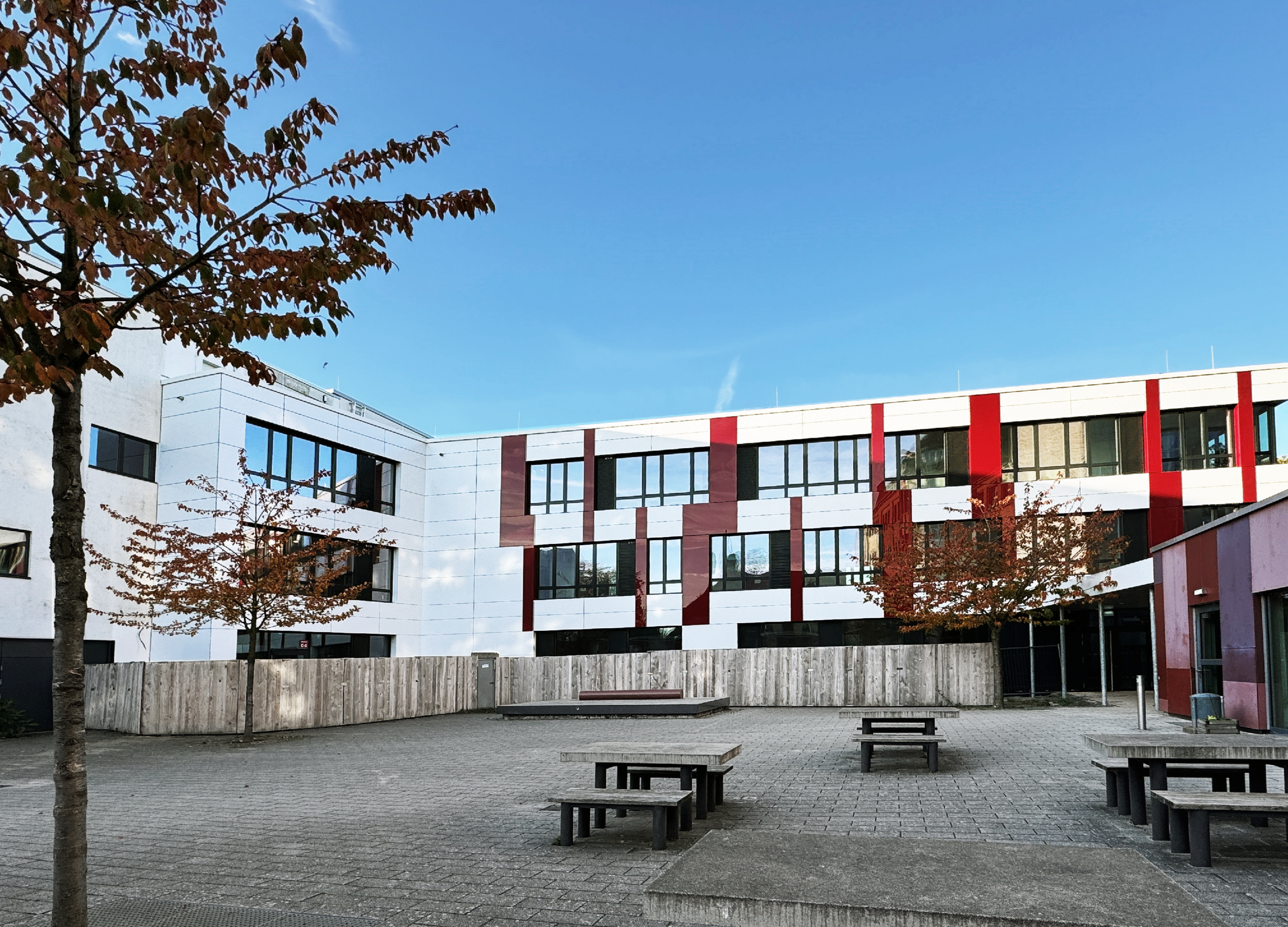 Der Neubau wurde an diese Erweiterung angeschlossen und durch ein offenes Vordach ergänzt, das den Neubau mit dem Altbau verbindet. Der Schulbetrieb wurde während der gesamten Baumaßnahme weiter betrieben.