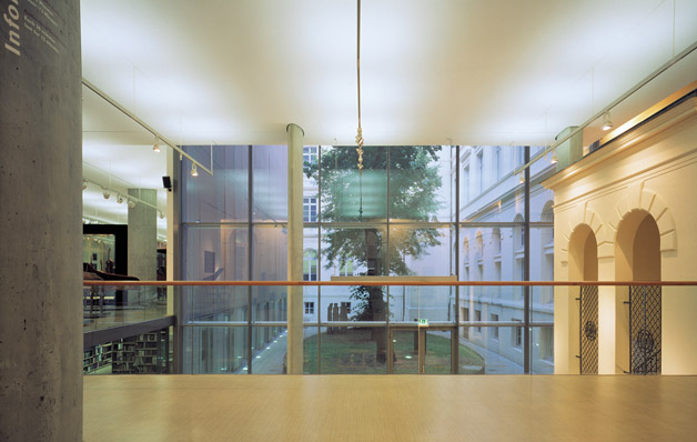Die durchscheinende Hülle verleiht dem Gebäude ein markantes und zugleich ruhiges Erscheinungsbild – ein bewusster, jedoch keineswegs dominanter Kontrast zum klassizistischen Bestand.