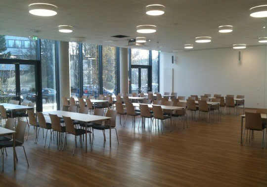 Im Erdgeschoss wurde ein Betriebsrestaurant für den gesamten Standort errichtet, welches auch als Veranstaltungsfläche flexibel nutzbar ist.
